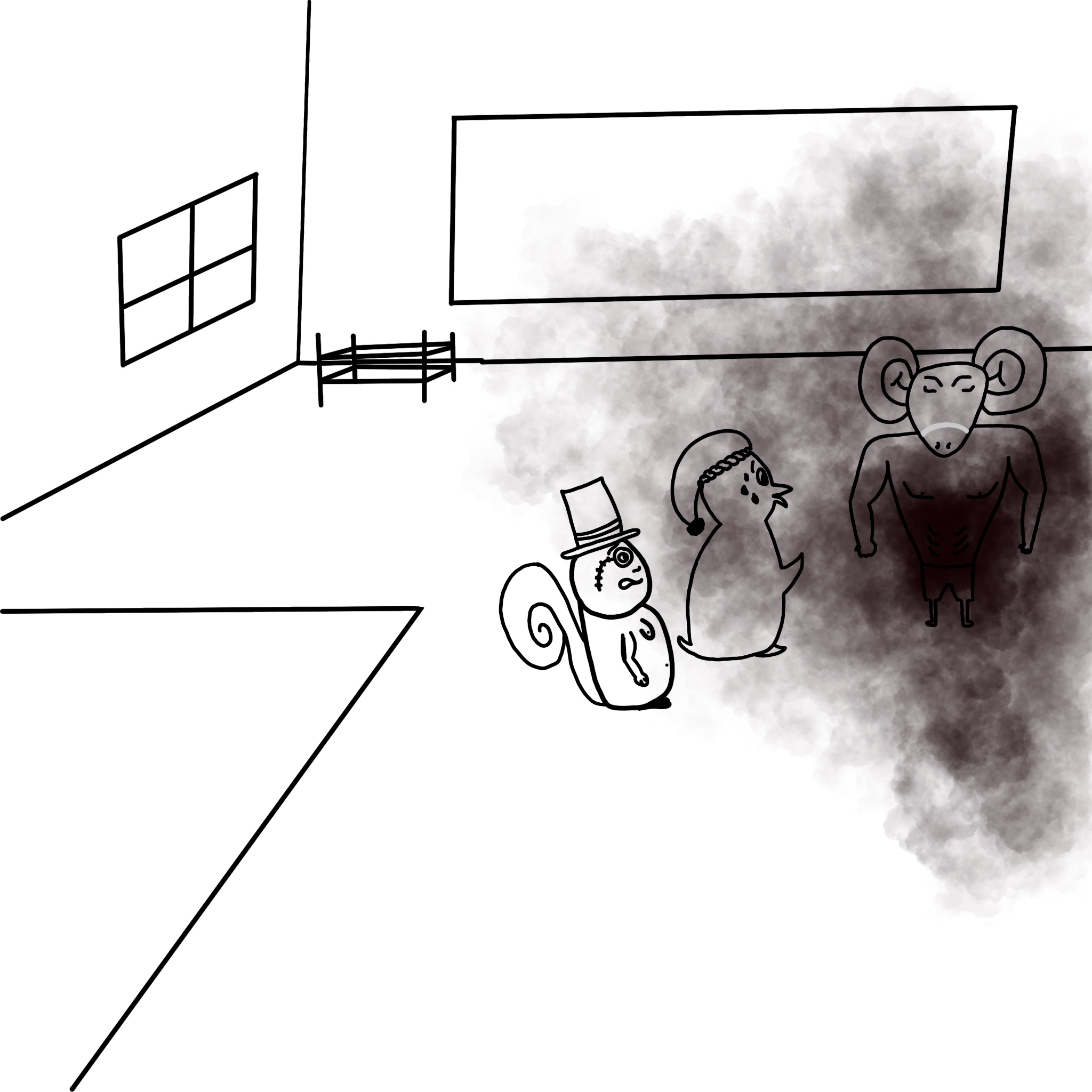 Kacki rannte mutig in Richtung der schwarzen Rauchwolke, in welcher immer wieder rote Blitze erstrahlten. Omen, der nun endlich auch den Ernst der Lage erkannt hatte, heftete sich an die Versen von Kacki um diese zu unterstützen. Bei der Beinpresse angekommen, erkannten die beiden, dass alle anderen bereits vor Angst geflohen sind.